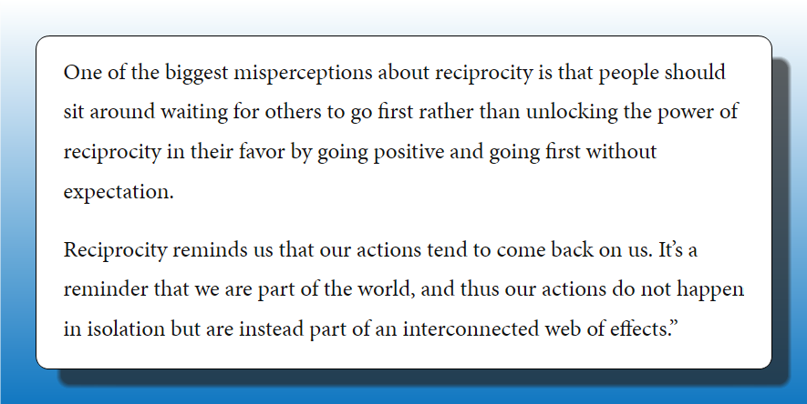 On Substack, there used to be office hours where all writers could share their publications and get feedback. I had shared my publication too but did not receive any feedback. But it made sense when I realized I hadn't read anyone else's publication either and hence it was wrong for me to expect any feedback on mine. I think the biggest takeaway from this article is ‘reciprocity should be the default’. Help others without expectation, if you are waiting for others to go first, you are missing the point.