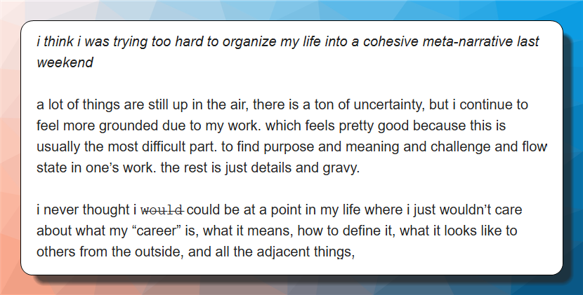 This resonated with me a lot. Many things that happen to us are random, but humans are suckers for narratives and stories, so we try to weave a narrative that makes logical sense. Not just about your career but everything in life. For example, if you do badly on a test and come home to a well-cooked meal, you feel like you don't deserve it.