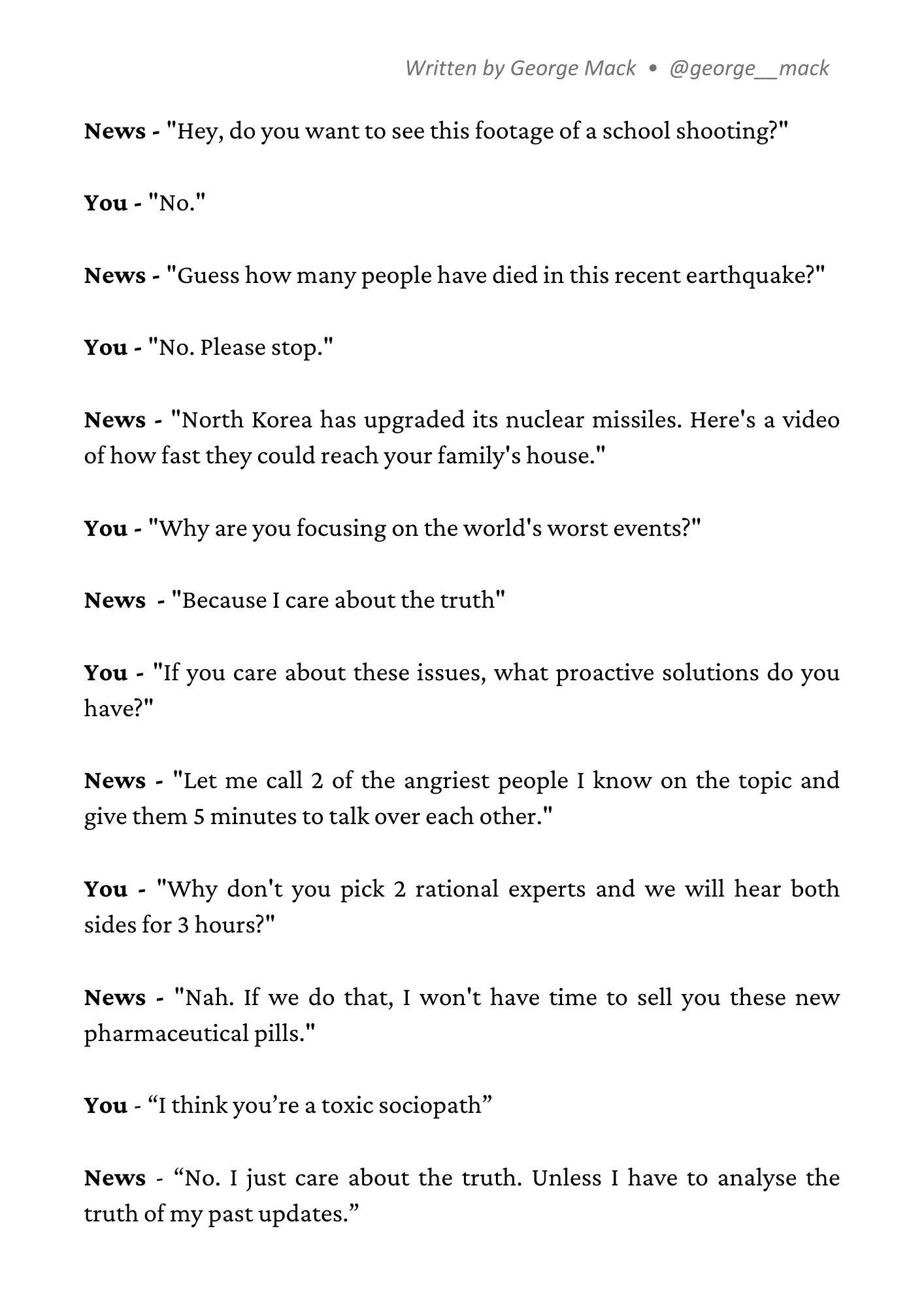 So, it’s better to just ignore all of it and focus on your goal, hopefully, something that would end up being useful to society at large. I found this article on how obsessively reading news prevents you from doing this.