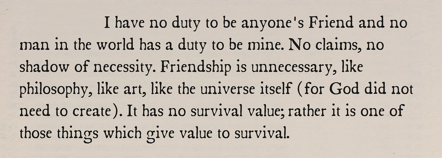 I thought about this a lot since reading it. For a person like me, who is always allured by productivity hacks, this doing things with no purpose or utility feels like an antithesis. However, I am fortunate to have truly valuable friendships and hence this idea that something necessary utility-wise can give you so much value was interesting to ponder upon.
